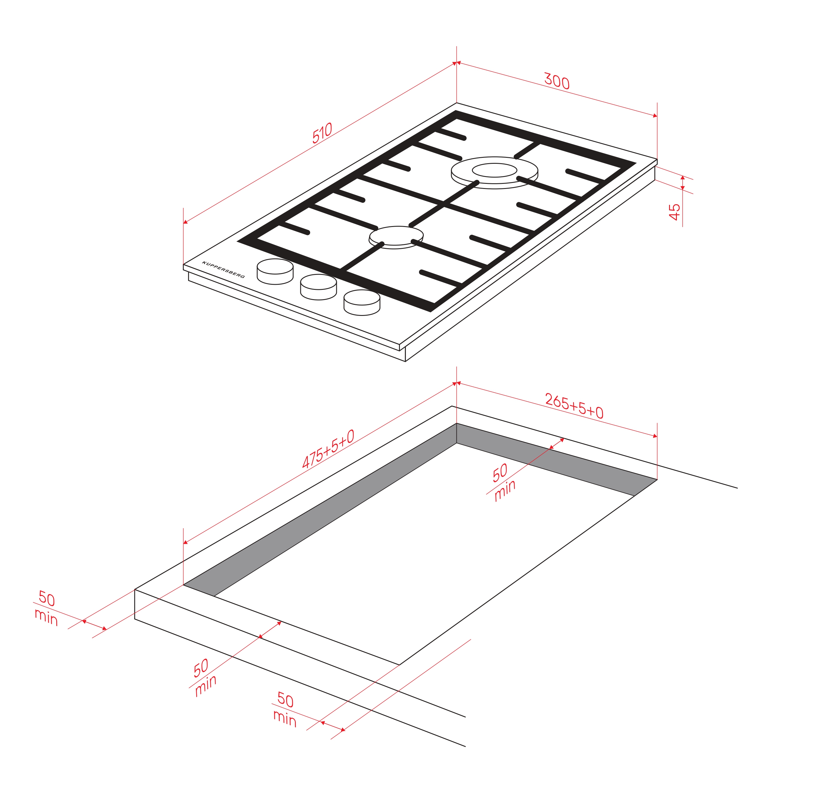 Небольшая высота корпуса и стандартная глубина упрощают встраивание в столешницу, а отсутствие рамки делает панель визуально лёгкой. Белая фурнитура поддерживает цельный внешний вид и подчёркивает современный характер модели.
